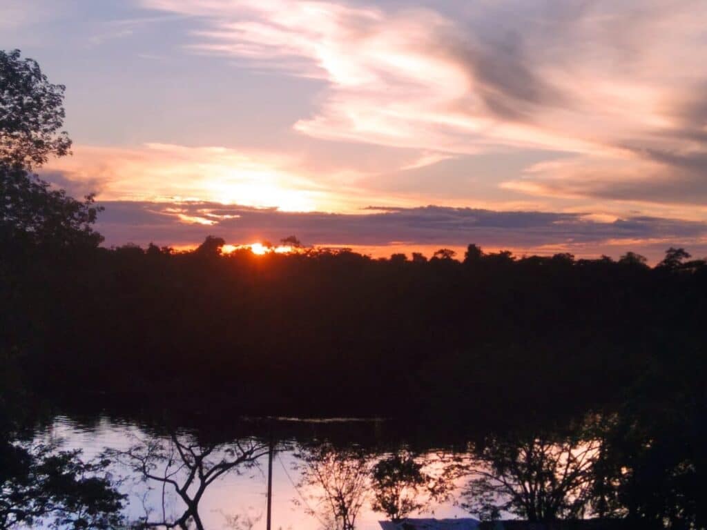 En este cielo que sobrevuela la tupida selva que demarca los ríos serpenteantes, en este, donde se dibujan estelas de color cuando hay tormenta seca, en este, es donde se dibuja la bandera tricolor, que es acompañada con una sinfonía de croar de ranas, aunque no se ven, allí están, como si marcaran el descanso diario del majestuoso sol – porque, cuando dice calentar, como se habla coloquialmente, lo hace con bastante fuerza -; su descanso va anunciando también, el retorno a sus nidos de muchas especies de aves, un fondo perfecto de siluetas, de luces, de sombras, de color.